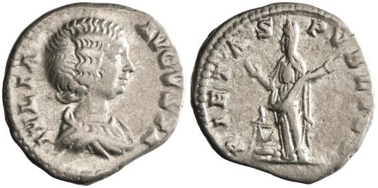 Roman: Julia Domna (193-217), silver denarius (3.62g), Rome mint, 193-217 CE. Draped bust right / Pietas standing left, raising both hands at altar.