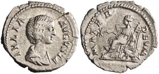 | Roman: Julia Domna (193-217), silver denarius (3.40g), Rome mint, 193-217 CE. Draped bust right / Cybele, towered, enthroned left between two lions, leaning on drum and holding br |