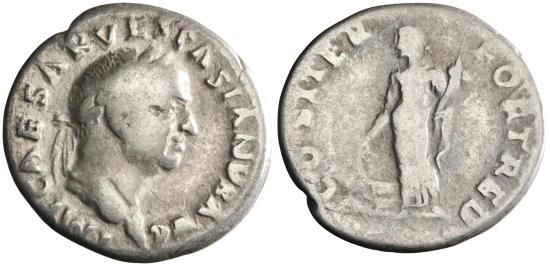Roman: Vespasian (69-79), silver denarius (2.99g), Rome mint, 70 CE. Laureate head right / Fortuna standing left, resting hand on galley prow and holding cornucopiae.