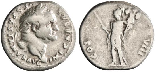 Roman: Vespasian (69-79), silver denarius (3.27g), Rome mint, 77-78 CE. Laureate head right / Mars standing left, holding spear and trophy.