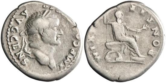 Roman: Vespasian (69-79), silver denarius (3.02g), Rome mint, 73 CE. Laureate head right / Vespasian seated right, holding sceptre and branch.