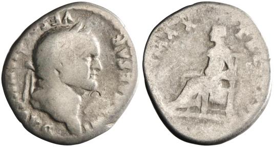 Roman: Vespasian (69-79), silver denarius (3.07g), Rome mint, 69-79 CE. Laureate head right / Figure seated left.