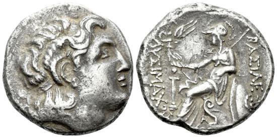 | Kings of Thrace, Lysimachus (323-281 BC) AR Tetradrachm (27.00 mm., 16.17 g.). Pergamum, circa 287-282. Diademed head of the deified Alexander r., with horn of Ammon. R/ Athena enthroned l., r. hand supporting Nike who crowns royal name, l. elbow resting on round shield propped against throne, transverse spear in background, monogram in inner l. field. Thompson –, cf. 220. VF |