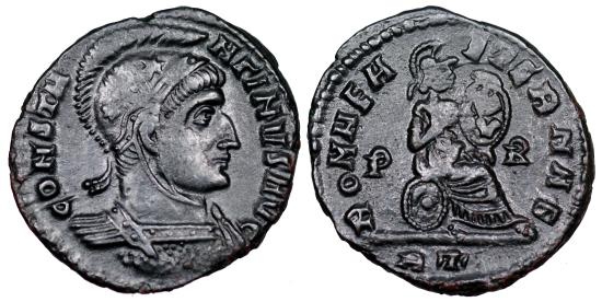 CONSTANTINVS AVG; helmeted and cuirassed bust right.