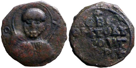 Tancred AE21 Follis. Saint Peter. Antioch Obv: Nimbate bust of St. Peter facing, raising his right hand in benediction and holding cross with his left. ΟΠЄ -ΤP-O-C. Rev: KЄBOI ΘHTOΔV ΛΟCOVT ANHPI 'Lord, help your servant Tancred', cross above and below. Metcalf 53. 1101-1112 AD. 4.55g. |