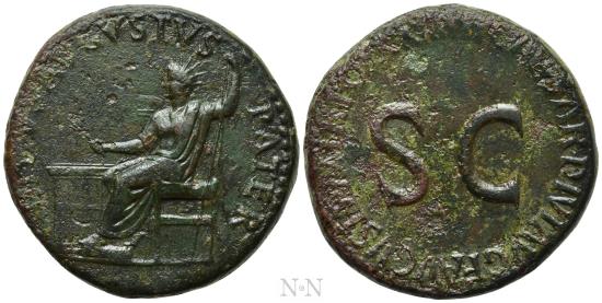 Obv: DIVVS AVGVSTVS PATER.Augustus, radiate, seated left before altar, placing foot on stool and holding branch and sceptre.Rev: TI CAESAR DIVI AVG F AVGVST P M TR POT XXIIII.Legend around large S C.