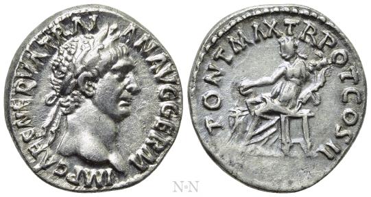 Obv: IMP CAES NERVA TRAIAN AVG GERM.Laureate head right.Rev: PONT MAX TR POT COS II.Concordia seated left, holding cornucopia and sacrificing from patera over altar.