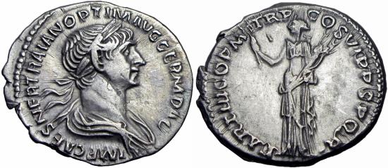 Trajan. AD 98-117. AR Denarius (17mm, 2.73 g, 5h). Rome mint. Struck circa autumn AD 116-August 117. Laureate bust right / Felicitas standing facing, head left, holding caduceus and cornucopia. RIC II 333; Woytek 570t; RSC 192. Choice EF.
