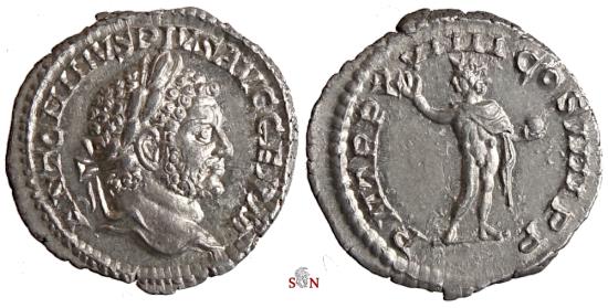 Caracalla Denarius, struck AD 215 at Rome mint. Obv: ANTONINVS PIVS AVG GERM, laureate head right. Rev: P M TR P XVIII COS IIII P P, Sol standing right, head left, holding globe and raising hand. 2,62 g, 19 mm. RIC 164a |