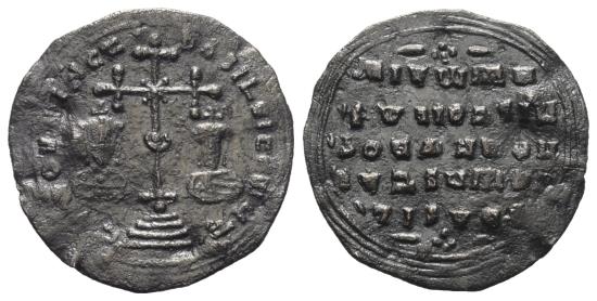 Obv: Cross on globe above four steps between the crowned busts of Basil in loros and Constantine in chlamys. Rev: Five-line inscription.