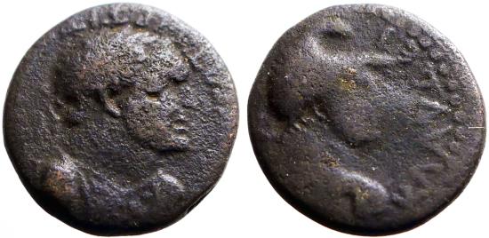 Titus, Caesar AE17 Lycaonia, Iconium. Perseus with Phrygian cap Obv: Laureate and cuirassed bust of Titus, right. ΑΥΤΟΚΡΑΤⲰΡ ΤΙΤΟϹ ΚΑΙϹΑΡ. Rev: Bust of Perseus with Phrygian cap, right; harpa behind. ΚΛΑΥΔƐΙΚΟΝΙƐⲰΝ. Struck during the reign of Vespasian, 69-79 AD. 4.50g. |