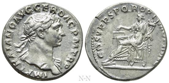 Obv: IMP TRAIANO AVG GER DAC P M TR P.Laureate bust right, with slight drapery.Rev: COS V P P S P Q R OPTIMO PRINC.Aequitas seated left, holding scales and cornucopia.