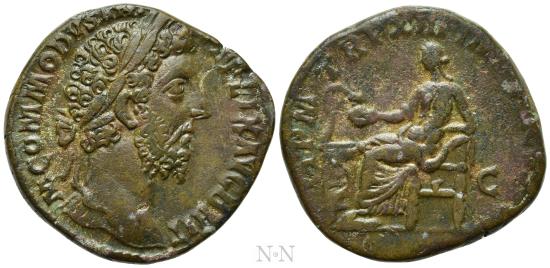 Obv: M COMMODVS ANT P FELIX AVG BRIT.Laureate head right.Rev: P M TR P XIII IMP VIII COS V P P / S - C.Salus seated left, holding patera, feeding serpent rising from altar, resting elbow on back on chair.