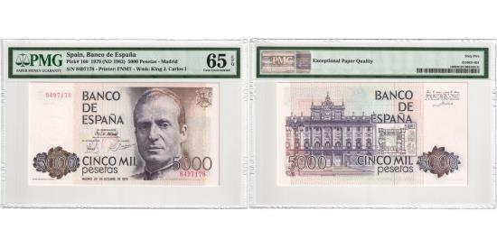 | | Spain, 5000 Pesetas, 1979-10-23, UNC 65 EPQ, PMG | | | Denomination in full letters and date on the left, facing bust of Juan Carlos I on the right., View of the Royal Palace of Madrid on the left, plan of the palace above the denomination in full letters on right field., Graded PMG UNC 65 EPQ Gem Unicrculated. | | FEATURES |