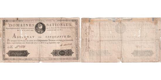 | | France, 50 Livres, 1790-09-29, 4K, VF(30-35) | | | Handwritten inscription on the reverse reading “mis en circulation à Bordeaux Le 26 Juin 1791” (put into circulation in Bordeaux on June 26, 1791) followed by a signature. | | FEATURES |
