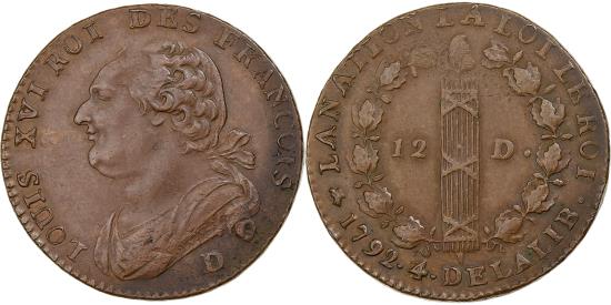 | | France, Louis XVI, 12 deniers François, 1792 / AN 4, Lyon, Copper, | | | Draped bust of Louis XVI, hair tied with a ribbon to the left, mint letter below., Denomination divided by a fasce surmounted by a Phrygian cap, within a laurel wreath; dates below., Coin in superb condition! | | FEATURES |