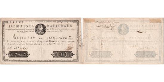 | | France, 50 Livres, 1790-09-29, 5J, EF(40-45) | | | Date in the upper frame, medallion with draped bust of Louis XVI and denomination below, serial and banknote numbers on the left, signature on the right., Handwritten inscription on the reverse reading “quarante (?)” followed by a signature. | | FEATURES |