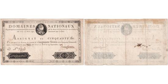 | | France, 50 Livres, 1790-09-29, D, EF(40-45) | | | Date in the upper frame, medallion with draped bust of Louis XVI and denomination below, serial and banknote numbers on the left, signature on the right., Handwritten inscription on the reverse reading “26,000”. The serial number consists of a single letter with no number in front. | | FEATURES |