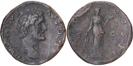 | | Antoninus Pius, Sestertius, 139, Rome, Bronze, , RIC:546 | | | Head of Antoninus Pius, laureate, right., Fides, draped, standing right, holding two corn-ears downwards in right hand and plate of fruit on raised left., RIC III Antoninus Pius 546., ANTONINVS AVG PIVS P P, TR POT COS II SC | | FEATURES |