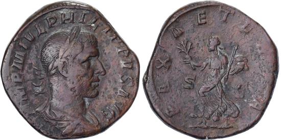 | | Philip I, Sestertius, 244-249, Rome, Bronze, , RIC:185 | | | Bust of Philip the Arab, laureate, draped, cuirassed, right, Pax, draped, running left, holding branch in right hand and transverse sceptre in left hand, RIC IV Philip I 185A (Sestertius), IMP M IVL PHILIPPVS AVG, PAX AETERNA / S C | | FEATURES |