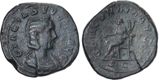 | | Otacilia Severa, Sestertius, 244-249, Rome, Bronze, , RIC:203 | | | Bust of Otacilia Severa, diademed, draped, right, Concordia, draped, seated left, holding patera in right hand and double cornucopiae in left hand, RIC IV Philip I 203E (Sestertius), OTACIL SEVERA AVG, CONCORDIA AVGG // S C | | FEATURES |
