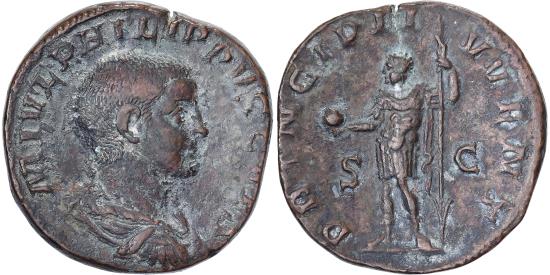 | | Philip II, Sestertius, 244-246, Rome, Bronze, , RIC:256 | | | Bust of Philip II, bare-headed, draped, right, Philip II, in military attire, standing left, holding globe in right hand and vertical spear in left hand, RIC IV Philip I 256A (Sestertius), M IVL PHILIPPVS CAES, PRINCIPI IVVENT / S C | | FEATURES |