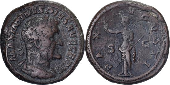 | | Maximinus I Thrax, As, 236-238, Rome, Bronze, , RIC:83 | | | Bust of Maximinus I, laureate, draped, cuirassed, right, Pax, draped, standing left, holding branch in extended right hand and transverse sceptre in left hand, RIC IV Maximinus Thrax 83, MAXIMINVS PIVS AVG GERM, PAX AVGVSTI / S C | | FEATURES |