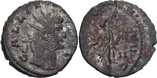 | | Gallienus, Antoninianus, 260-268, Siscia, Billon, , RIC:580 | | | Radiate head of Gallienus to right., Providentia, draped, standing left, holding baton in right hand and cornucopiae in left hand; at his feet, globe, RIC V Gallienus 580, GALLIENVS AVG, PROVI AVG | | FEATURES |
