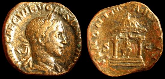 Volusian AE Sestertius. Rome Mint 251-253 AD. Obverse: IMP CAE C VIB VOLVSIANO AVG, laureate, draped and cuirassed bust right, seen from behind. Reverse: IVNONI MARTIALI, Juno seated facing in domed distyle temple, S-C across fields. RIC: 253a. Size: 27mm, 16.88g. Scarce |