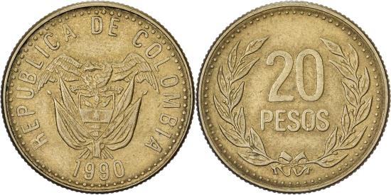 | | Colombia, 20 Pesos, 1990, Aluminum-Bronze, , KM:282.1 | | | Flagged arms above date, 72 beads circle around the rim, Denomination within wreath, Varieties exist. | | FEATURES |