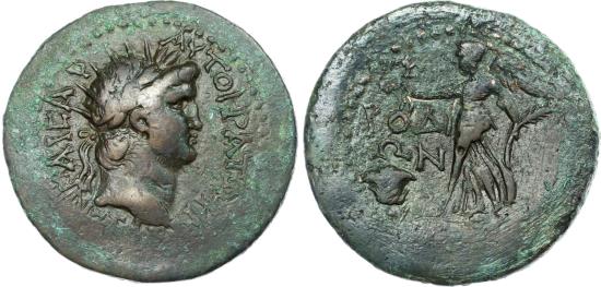 Nero (AD 54‑68) Bronze Unit, Rodes, 23.79g. KAICAP AYTOKPATΩP NEPΩN, radiate head of Nero right. Rev. POΔIΩN, Nike advancing left on prow, holding wreath and palm, rose to left. (RPC 2772; SNG Keckman 769). Good Very Fine for issue.