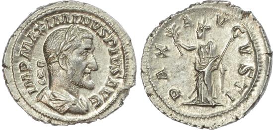 Maximinus Thrax (AD 235‑238) Silver Denarius, Rome, AD 235‑236, 3.12g. IMP MAXIMINVS PIVS AVG, laureate, draped and cuirassed bust of Maximinus right. Rev. PAX A‑VGVSTVS, Pas standing left, holding sceptre and palm. (RIC 12). Good Extremely Fine.