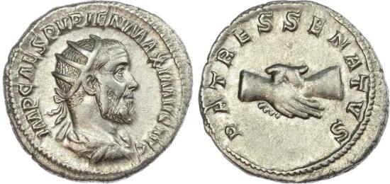 Pupienus (AD 238) Silver Antoninianus, Rome, 5.16g. IMP CAES PVPIEN MAXIMVS AVG, radiate, draped and cuirassed bust of Pupienus right. Rev. PATRES SENATVS, clasped hands. (RIC 11b; BMC 92‑94). Extremely Fine.