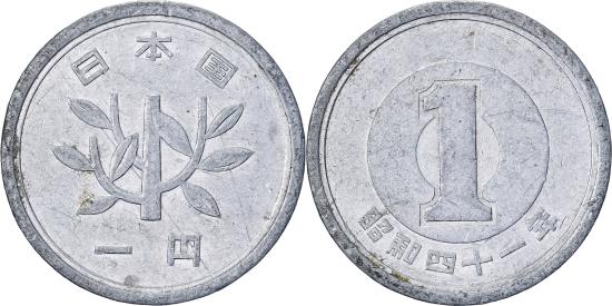 | | Japan, Hirohito, Yen, 1966, Aluminum, , KM:74 | | | Sprouting branch in center, authority on top, value and denomination on bottom, Numeral 1 within 2 inner circles, date on bottom | | FEATURES |