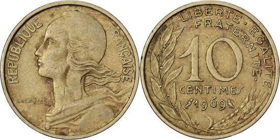 | | France, 10 Centimes, Marianne, 1969, Paris, Aluminum-Bronze, , Le | | | Marianne, Liberty bust left, Denomination above date, grain sprig below, laurel branch at left, Without mint mark. 1991-1993 dated coins, non-Proof, exist in both coin and medal alignment., Henri Lagriffoul | | FEATURES |