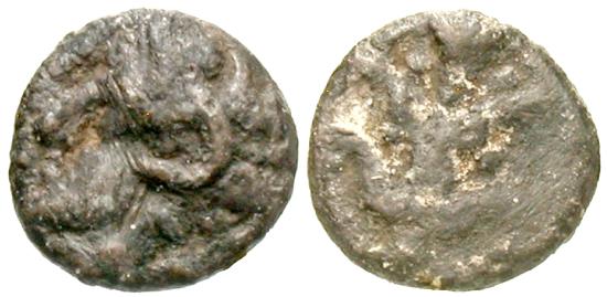 I've only seen examples of this type with Zeus Ammon's head facing right and either inside a square or circular incuse surrounded by a dotted border. In this issue, the head of Zeus Ammon stretches across the flan without any border.