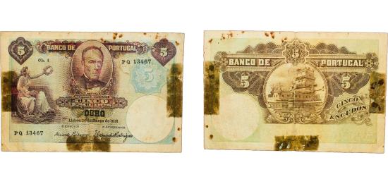 Portugal First Republic 1918 5 Escudos (1st. print) Paper VF Repaired P 114 Silva 012 to 019