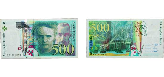 France Fifth Republic 1994 500 Francs - Pierre & Marie Curie (type 1993) Paper (558000000) XF Holed P 160 Fay 76