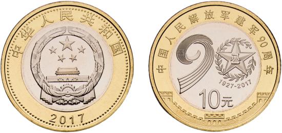 China People's Republic 2017 10 Yuan (90th Anniversary of Chinese People’s Liberation Army) Bimetallic: copper-nickel centre in brass ring 9.2g BU