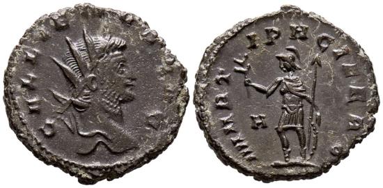 | GALIENO. Antoniniano. (Ae. 4,47g/22mm). 265-268 d.C. Roma. (RIC 236). Anv. Cabeza radiada de Galieno a derecha, alrededor leyenda: GALLIENVS AVG. Rev: Marte estante a izquierda po |