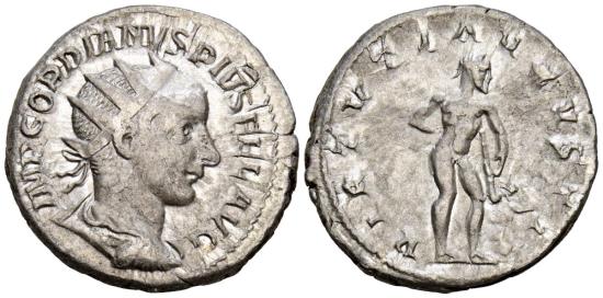 GORDIAN III. Antoninian. (Ar. 5.55g/22mm). 241-243 AD Rome. (RIC 95). Anv: Radiated and draped bust of Gordian III to the right, around legend: IMP GORDIANVS PIVS FEL AVG. Rev: Hercules standing on the left leaning on a mallet, around legend: VIRTVTI AVGVSTI. Very Fine.