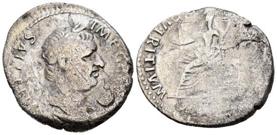 VITELIO. Denario. (Ar. 3,19g/19mm). 69 d.C. Lugdunum. (RIC 59). Anv: Cabeza laureada de Vitelio a derecha, alrededor leyenda: A VITELLIVS IMP GERMAN. Rev: Vesta velada sentada a izquierda portando antorcha y patera, alrededor leyenda: VESTA P R QVIRITIVM. MBC-.