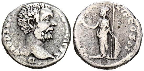 CLODIUS ALBINUS. Denarius. (Ar. 3.00g/17mm). 194-195 AD Rome. (RIC 7). Obv: Head of Clodius Albinus facing right, surrounding legend: D CLOD SEPT ALBON CAES. Rev: Minerva standing left carrying a spear, shield and branch, surrounding legend: MINER PACIF COS II. VF.