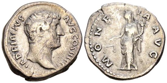 HADRIAN. Denarius. (Ar. 2.80g/18mm). 136 AD Rome. (RIC 2224). Obv: Head of Hadrian facing right, around legend: HADRIANVS AVG COS III P P. Rev: Coin standing left holding scales and cornucopia, around legend: MONETA AVG. VF+.