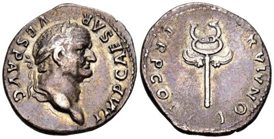 VESPASIAN. Denarius. (Ar. 2.80g/20mm). 74 AD Rome. (RIC 703). Obv: Laureate head of Vespasian facing right, surrounding legend: IMP CAESAR VESP AVG. Rev: Winged caduceus, surrounding legend: PON MAX TR P COS V. VF+. Beautiful patina.