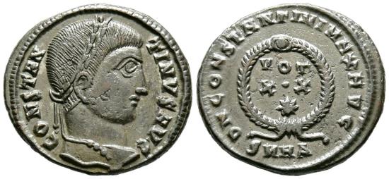CONSTANTINE I. Follis. (Ae. 3.00g/19mm). 324 AD Heraclea. (RIC 64). Obv: Laureate head of Constantine I facing right, surrounding legend: CONSTANTINVS AVG. Rev: Legend: VOT/XX, within a laurel wreath, below: SMHA, surrounding legend: DN CONSTANTINI MAX AVG. Extremely Fine.