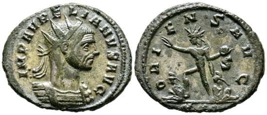 AURELIAN. Antoninianus. (Ae. 3.66g/23mm). 270-275 AD Serdica. (RIC 279). Obv: Radiated and cuirassed bust of Aurelian facing right, around legend: IMP AVRELIANVS AVG. Rev: Sun advancing to the left carrying a globe and raising his right hand, at his feet two seated captives, field: S, in exergue: XXI, around legend: ORIENS AVG. Extremely Fine.