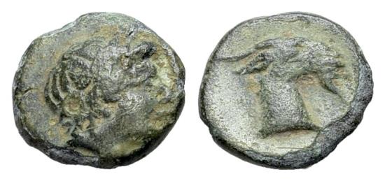 Aeolis, Aigai, 4th-3rd centuries BC. Æ 10mm. Head of Apollo. R/ Head of goat