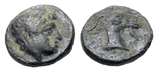 Aeolis, Aigai, 4th-3rd centuries BC. Æ 10mm. Laureate head of Apollo R/ Head of goat