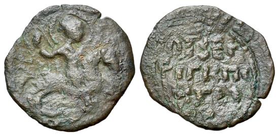 Crusaders, Antioch. Roger of Salerno (1112-1119). Æ Follis (22mm, 2.09g, 6h). Third type. St. George, nimbate, on horseback r., spearing [Dragon] R/ Legend in four lines. Metcalf, Crusades 100; CCS 9. VF